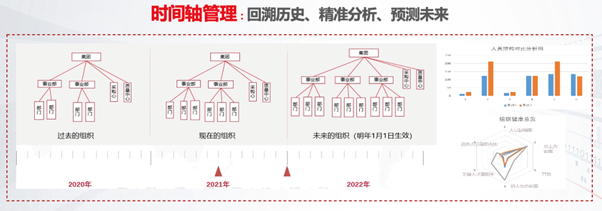 灵活组织架构调整:基于时间轴,企业不仅可以对当前的组织架构进行调整,还可以对过去和未来的架构进行调整; 全生命周期组织数据:企业可以查看任意日期的组织架构体系,完善时间轴模型,记录组织全生命周期数据; 精准分析支撑决策:通过同比、环比等人员结构对比分析数据,让管理者了解组织的人员构成、离职率等,提供更精准的决策支撑依据。