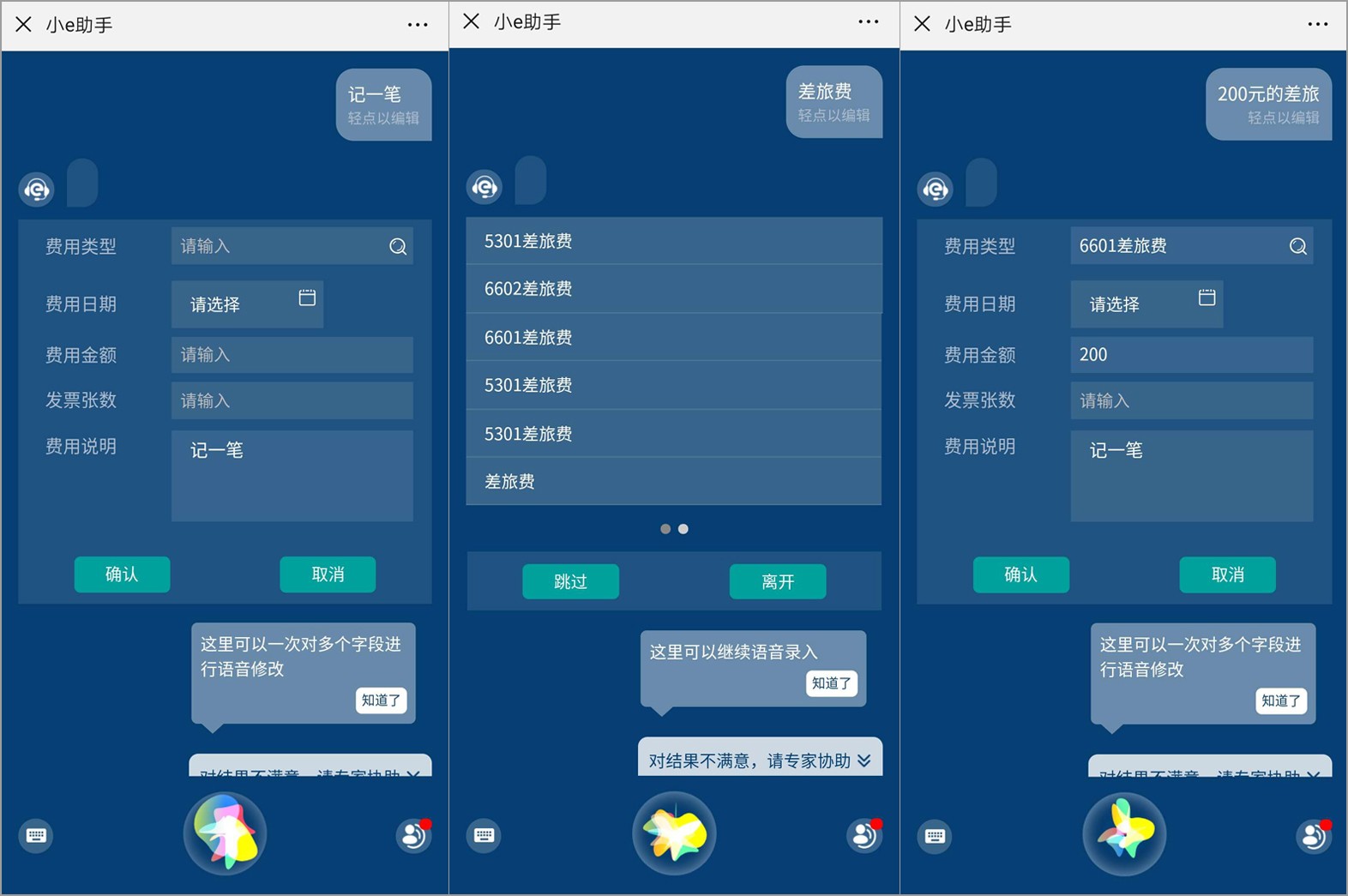 语音报销:用小e智+能发起报销流程,小e会根据所述报销类型、金额帮您快速填单,报销。